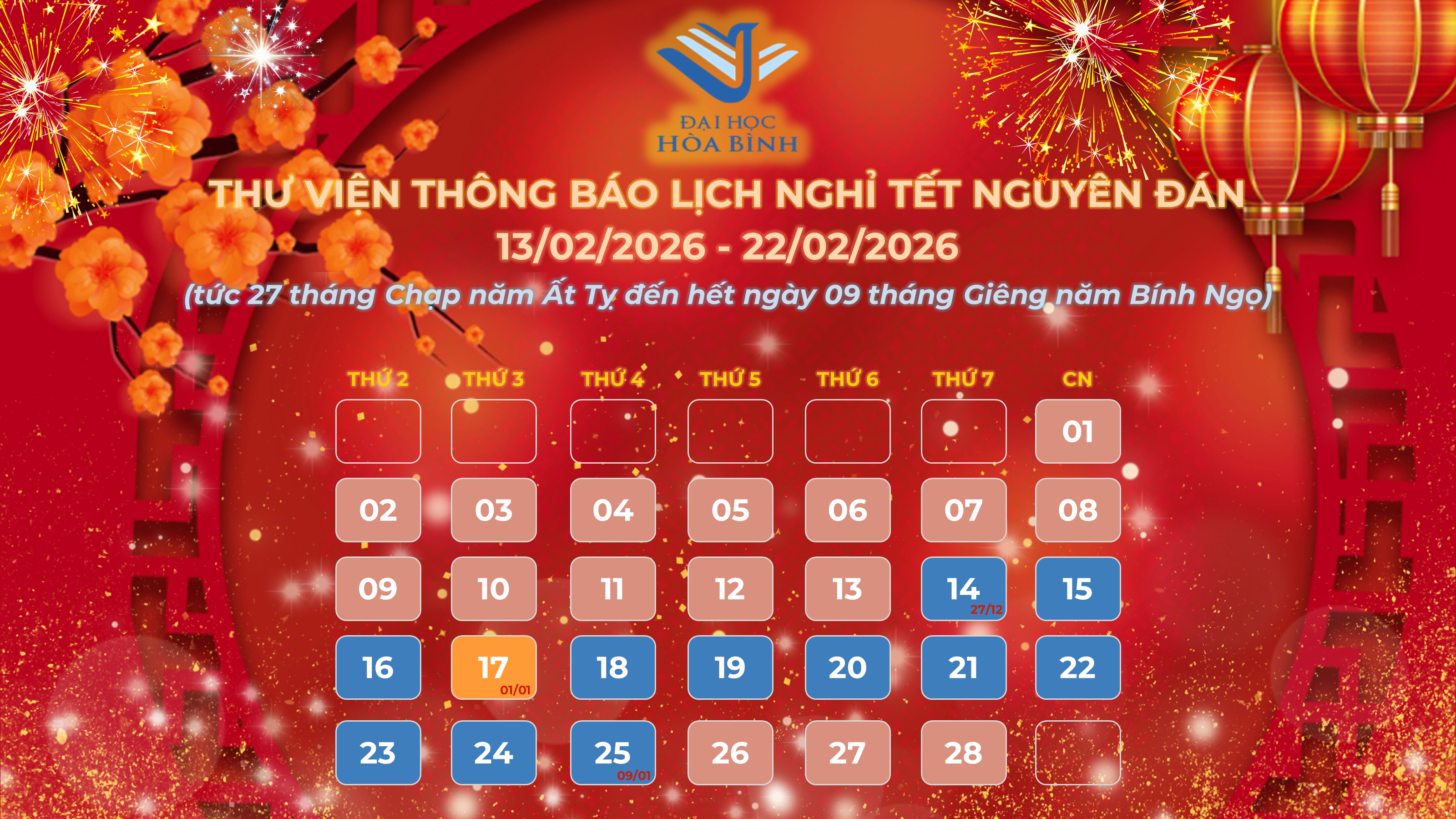 Thư viện Đại học Hòa Bình thông báo lịch nghỉ Tết Nguyên đán 2026